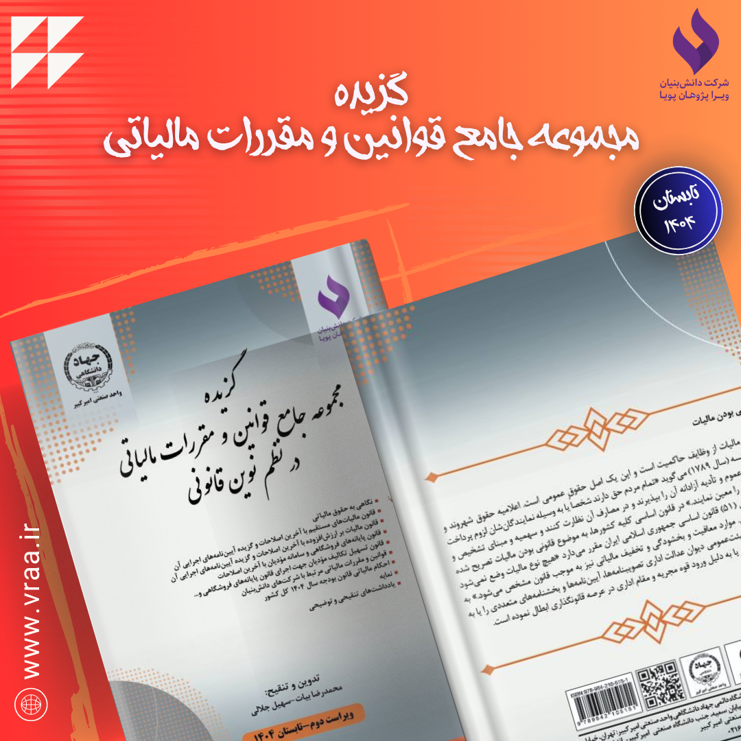 ویراست دوم کتاب گزیده مجموعه جامع قوانین و مقررات مالیاتی در نظم نوین قوانین در قطع وزیری برای تابستان سال ۱۴۰۴ منتشر شد. این کتاب دارای کد فروش بوده و از طریق سامانه ستاد قابل خرید و در سامانه مودیان ثبت خواهد شد.